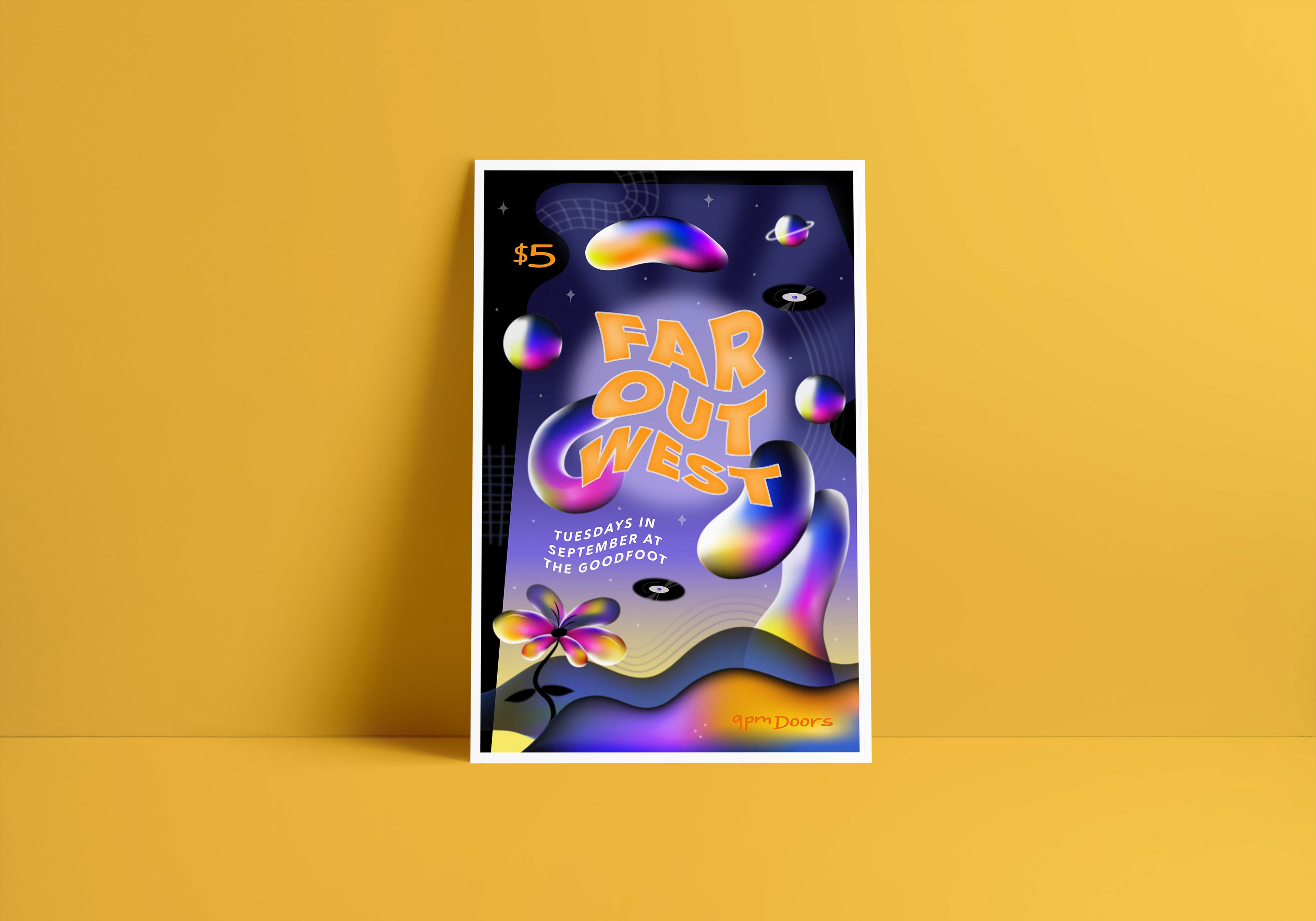 A poster design to promote the band Far Out West and their show at the Goodfoot Lounge. This poster appeared at the bar as well as on the streets around SE Portland.