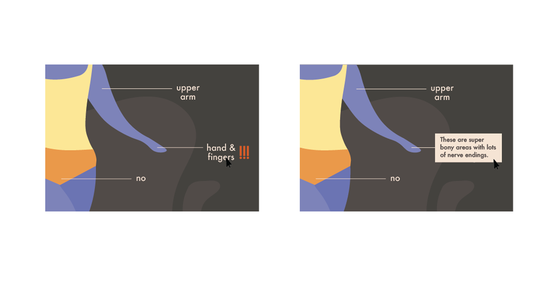 For this interactive map, I decided to do a web article about the pain rate of tattoos in specific spots vs. others. The demographic I was leaning towards were women ages 18-24. When certain body parts are hovered over, the icon pops up indicating which level of pain would come with a tattoo in that spot. When clicked on, an explanation as to why appears. There is a secondary level of infographic as well which is a How To for aftercare.